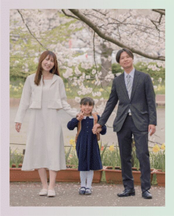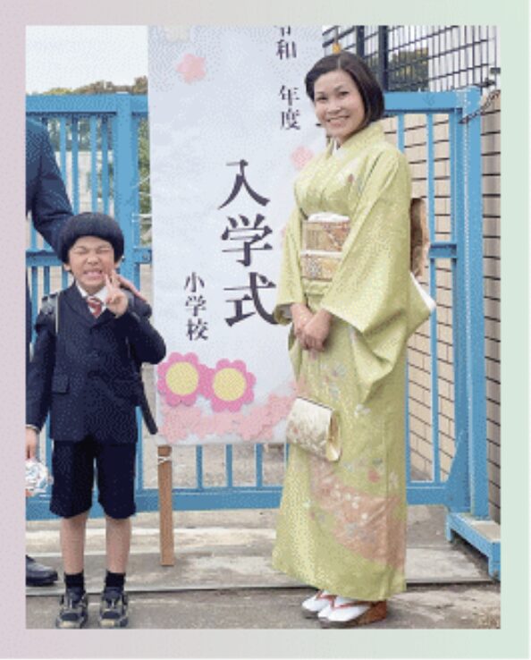 子供の行事で着物が着たくて、自分で着られるように着付けを習っていたこともあり、思い切って着物にしました。入学式は新生活の始まりだし、フレッシュな色味の着物をセレクトして、季節感を大切に。子供が主役の行事なので、小物などは控えめな色味で。ちなみに卒園式は薄ピンクの着物で、もう少し華やかにしました!