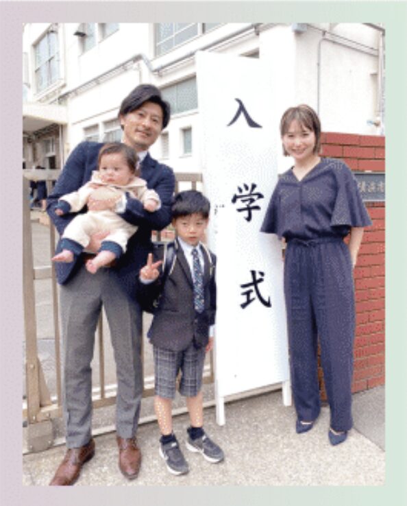 かためのセットアップは着慣れていないし、絶対似合わないと思ったので、普段でも着れそうなアイテムに、色やジャケット合わせで特別感を出しました。合わせ方を変えて、今でもデイリーに活躍しています!夫と私は紺ブレでリンク。夫と息子は蝶ネクタイでリンクさせ、家族での統一感をなんとなく意識しました。