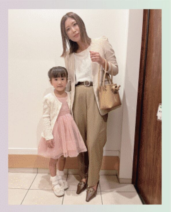 日常的にフォーマルな格好はあまりせず、カジュアルな服を着ることが多いので、普段でも使えそうなアイテムにジャケットを合わせることで、フォーマル感を出しました。娘とのバランスもあるし、結構悩みました。卒園式では、娘は制服着用になるので、私はこのコーデでバッグと靴をブラックに変更する予定です!