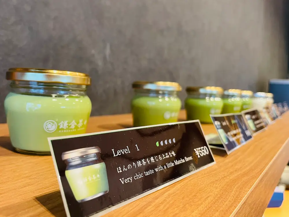 一言で抹茶と言っても、香りや苦味など特徴はさまざま。甘くてちょっぴりほろ苦い味が好みの方もいれば、茶葉の味がダイレクトに伝わる味が好みの方もいます。鎌倉茶々では、様々な抹茶ファンのために、抹茶の濃さを5段階に分けたジェラートとプリンを販売。