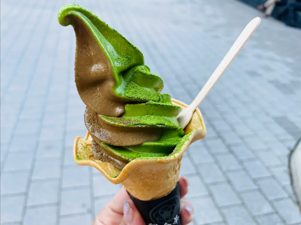 御成店に行くならば絶対に外せない商品があります。まず1つ目は、棒ほうじ茶を使用した香ばしい味わいの御成店限定「ほうじ茶ソフト」と、鎌倉茶々人気NO.1の抹茶プレミアムソフトの両方が楽しめる「ミックスソフト」(690円)。甘さは比較的控え目。抹茶のコクとほうじ茶の香ばしさが相性抜群な1品でした。また、これでもかっ!というくらいの抹茶パウダーをかけてくれるので、より一層高級感を味わうことができました。