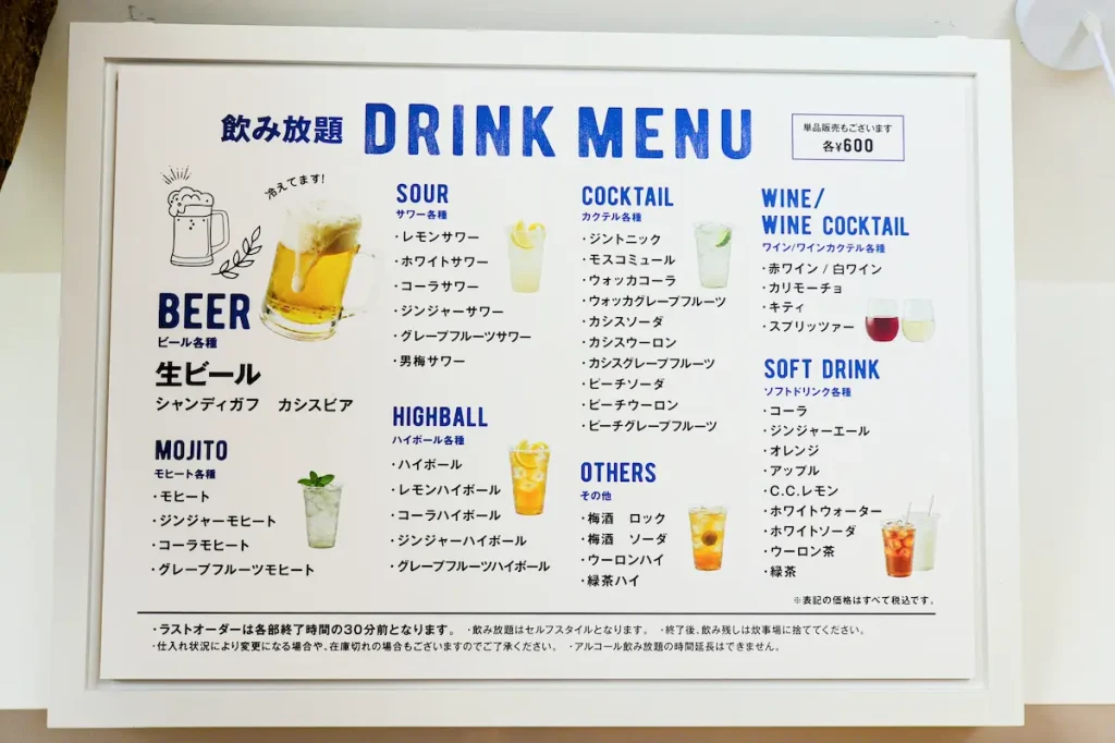 ソフトドリンク飲み放題¥400/1名、アルコール飲み放題¥1,700/1名