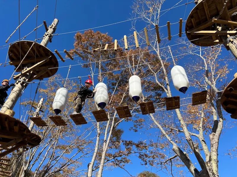 目玉は、森の中を駆け抜ける、全長150mのジップラインや、空中アスレチックを楽しめる「TOBIZARU」(小学生以上が利用可)。ハーネスを直用し、ロープの上を渡ったり、高さ約8mのボルダリングに挑戦することができます。